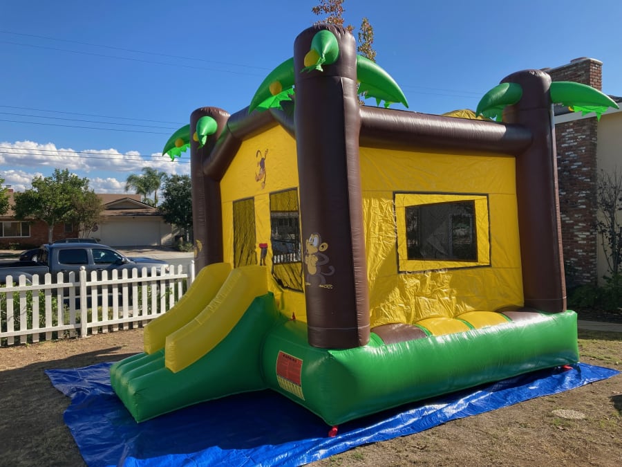 Our Jungle Bounce House is designed with safety and comfort in mind. It features plenty of room for kids to jump, bounce, and play to their heart's content. This Jungle Themed Bounce House will fit most yards with a footprint of 16FT x 20FT. The bounce house comes with an attached slide as an entrance.